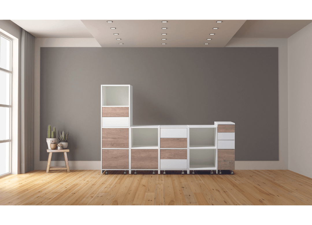 Ripiano standard / Standard shelf cm 70. A richiesta / On demand cm 90 Struttura in nobilitato bianco spessore 25 mm. Colore ripiano e frontali cassetto: bianco/rovere/cemento. Guide cassetto push and pull. N°2 passacavo Ø 60 mm. N.B. COD. TAV.741 su tutti i modelli l’accessorio “mensole gamba” è escluso